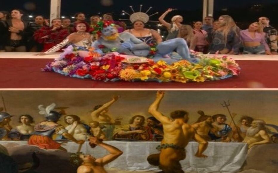En la transmisión apareció un señor con barba rubia, medio desnudo y pintado al completo de azul. Tras él, una variopinta escolta donde había de todo en esta especie de bacanal y celebración: una señora con una corona, drag queens, muchas y muy diferentes: negras, rubias con barba, con colorete, con melena pelirroja, y todo ello amenizado con un conjunto de bailarines a su alrededor. De fondo, una representación que podía recordar a la famosa Última Cena, de Leonardo Da Vinci.