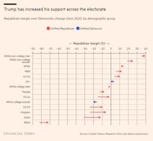 Este voto fue, más que nada, un voto de castigo que terminó por mover a personas de todas las edades, sexos y grupos demográficos hacia la derecha. El castigo fue económico, sí, pero basado en género y raza también.