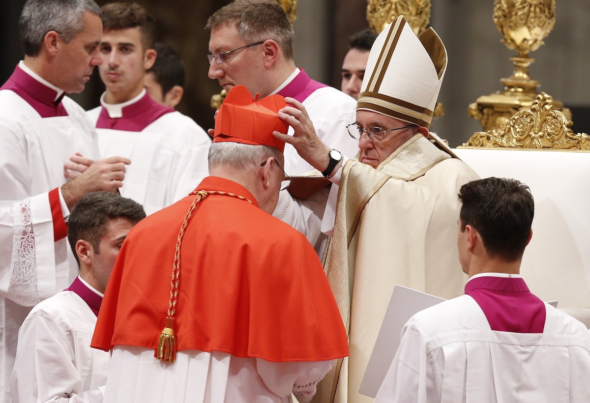 Pope Francis places a red biretta on new U.S. Cardinal Kevin J. Farrell during a consistory in St. Peter's Basilica at the Vatican in this Nov. 19, 2016, file photo. The pope will create 20 new cardinals at an Aug. 27 consistory, further placing his mark on the College of Cardinals that will one day elect his successor. (CNS photo/Paul Haring)